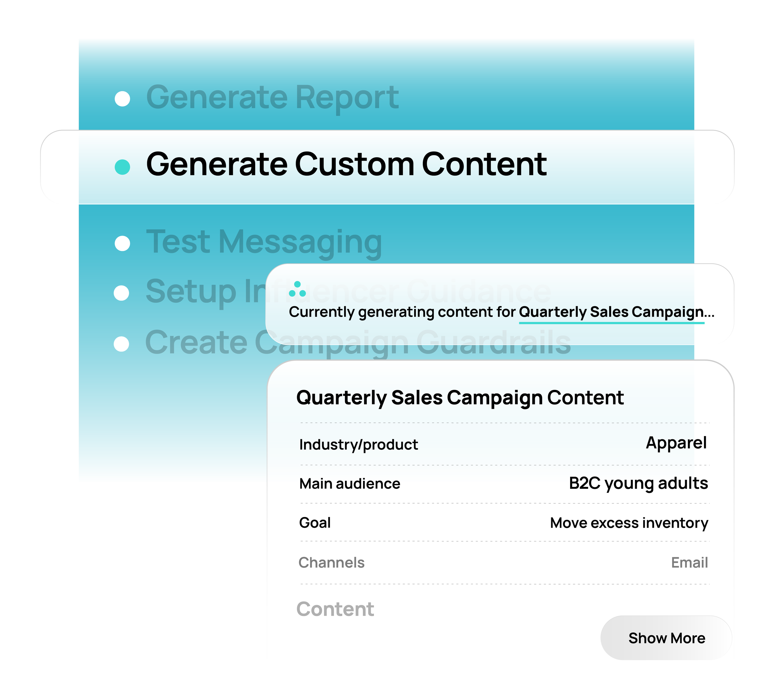 We turn your intelligence into custom resources you’ll actually use. Jump start your creative brainstorming with our custom content and strategy recommendations. Leverage co pilot to generate messaging, campaign guardrails, influencer guidance, and opportunity maps.